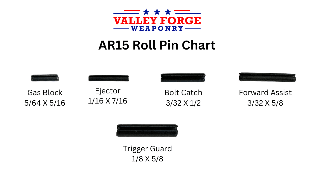 A Roll Pin Kit for the AR15 Upper and Lower receivers. This kit includes roll pins for the Bolt Catch, Ejector, Forward Assist, Gas Tube, and Trigger Guard. Made from Spring Steel, these roll pins are strong, wear resistant and meet ASME B18.8.2 specifications.